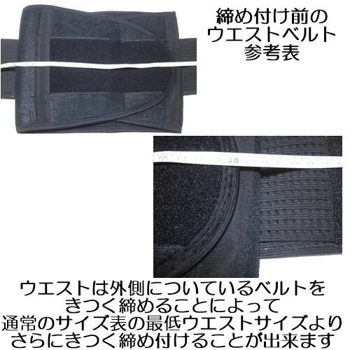 締め付け幅が調節できる仕様で体型にフィット、フロント部分のマジックテープを締め付けてウエスト銅部分をぎゅっと引き締めて、着用時にウエストを締め付け